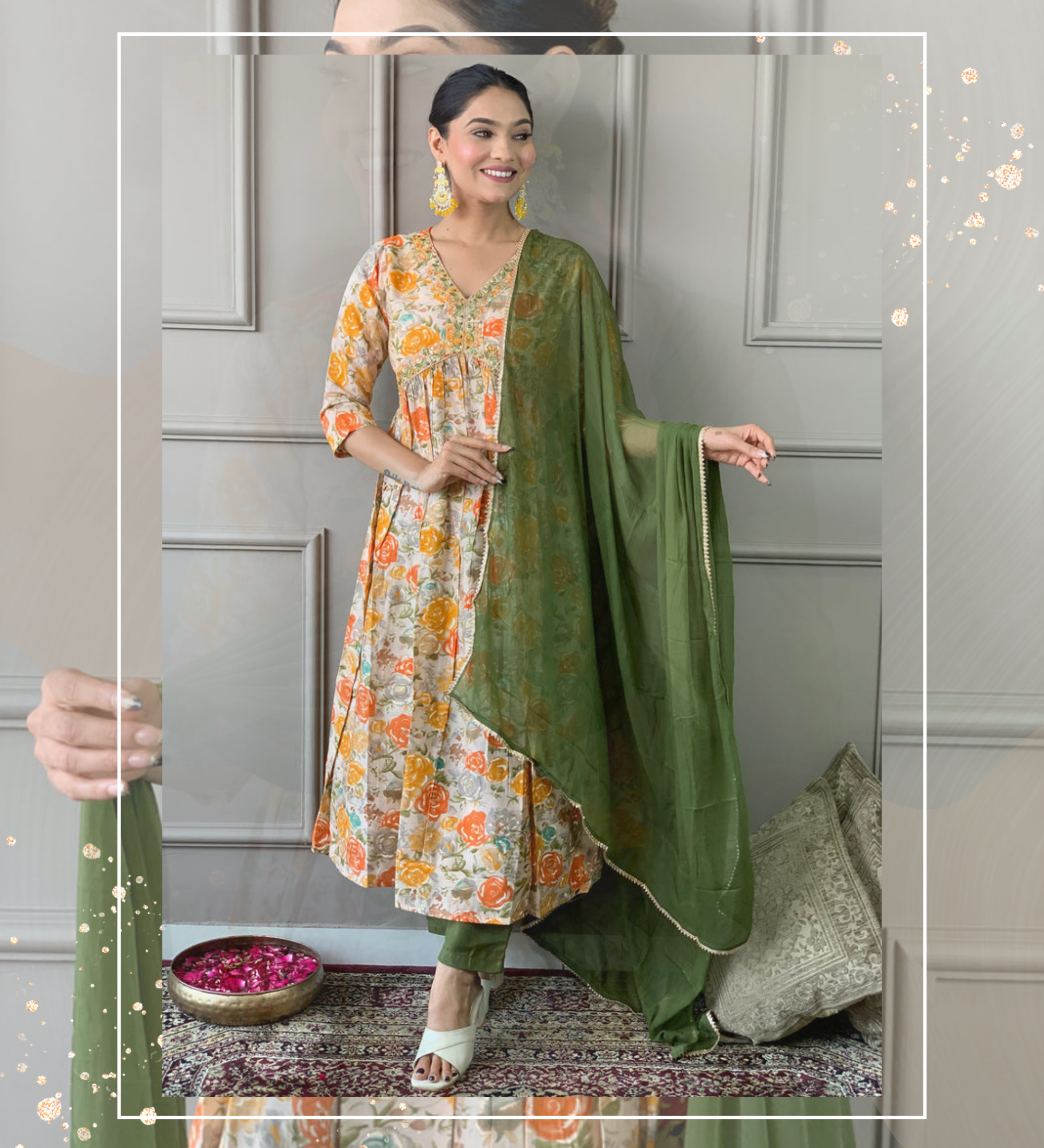 Floral Cotton Slub Kurti Set with Chanderi Cotton Dupatta